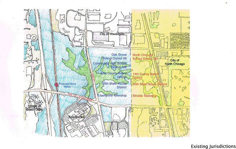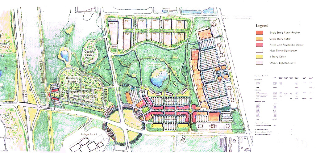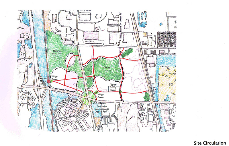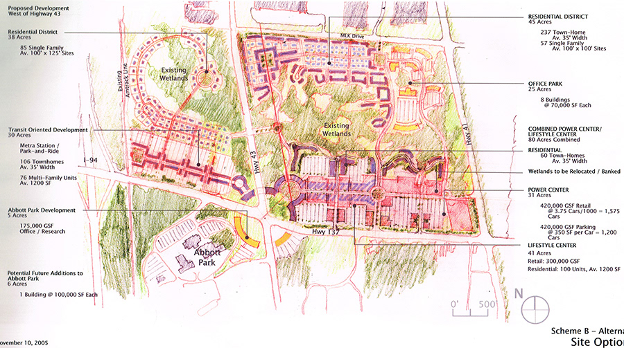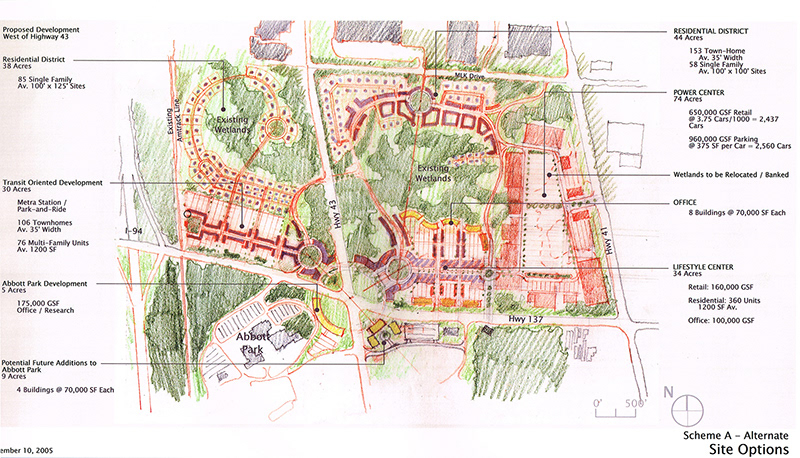 Abbot Park was a proposed mixed-use development located on an undeveloped parcel of land adjoining Abbott Labs in the Village of North Chicago. Working with both the Village and Abbott a number of "districts," distinct but interconnected were designed around natural wetlands that weaved in and out of parts of the site, providing a natural amenity and glue to hold the disparate parts of the development together. The nature of the streets surrounding the site was used to determine the character of the development adjoining it: a dense retainl/residential/entertainment district along Buckley road directly across from Abbott Labs; a large promotional retail center along the heavily traveled Highway 41; and lower scale detached and semi-detached housing along Waukegan Road.