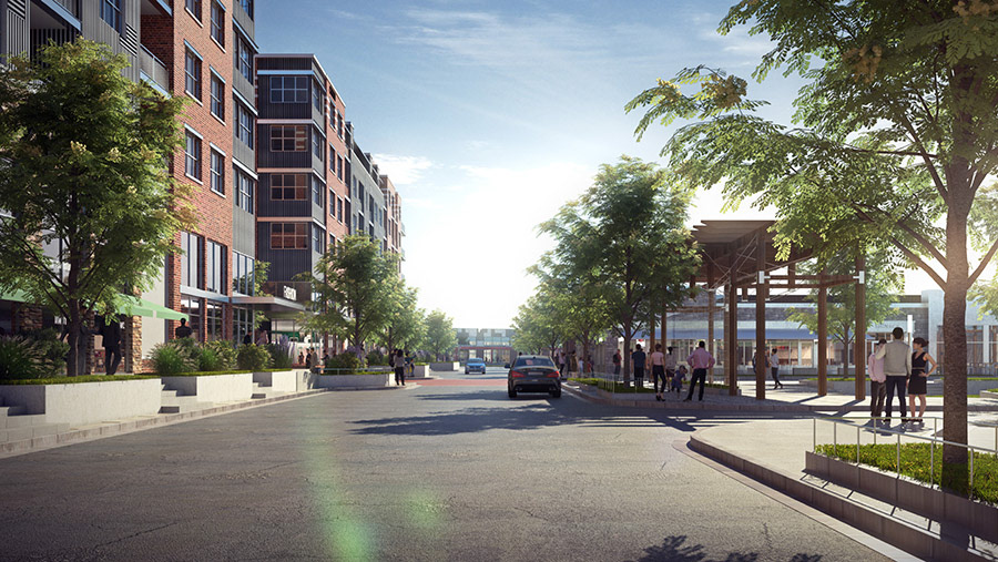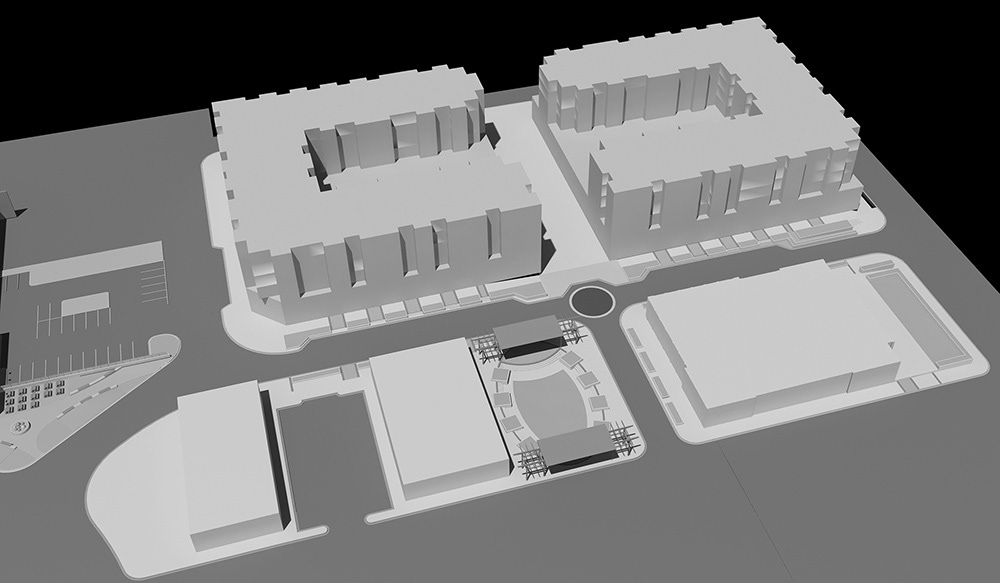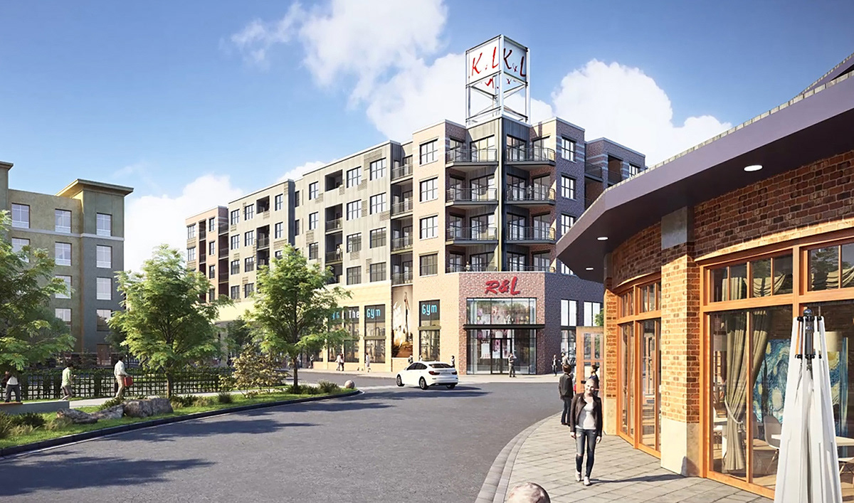 Phase III of the Mayfair Collection comprises the first mixed-use buildings for the district. Consisting of retail and office under four floors of residential, these building sit at the center of the development, with one-story restaurants and performance plaza directly in front, flanked by retail and hospitality. View corridors into the site helped establish massing and architectural features. The exterior is developed as a mixture of the gritty industrial vocabulary of Phases I and II, but with the addition of a two-story retail base. Tall storefronts with canopies surrounded by masonry face a wide sidewalk and broad planters with steps between that negotiate the slightly sloped street beyond.