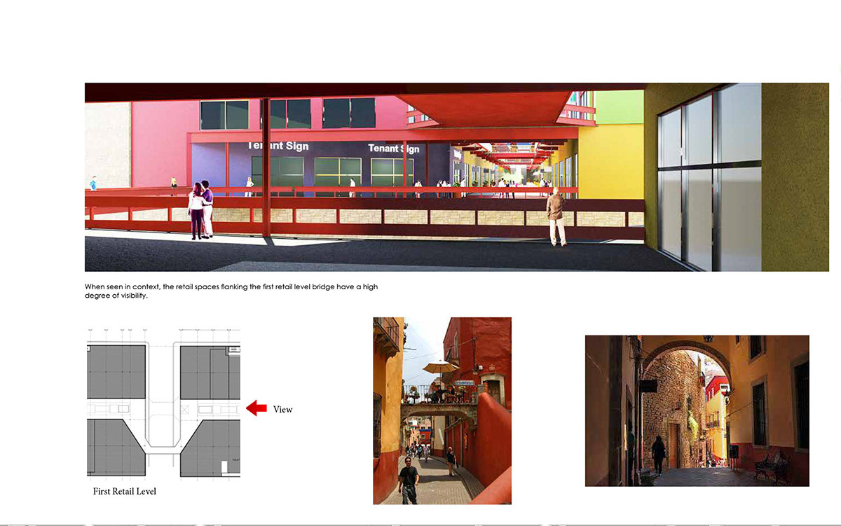 The two-level open air shopping is accessed by two express escalators, by-passing the second floor and depositing all shoppers at the top level. The interior of the arcades are designed to recall the shopping streets of Mexican colonial cities such as San Miguel de Allende and Guanajuato in its colors and intricacy.