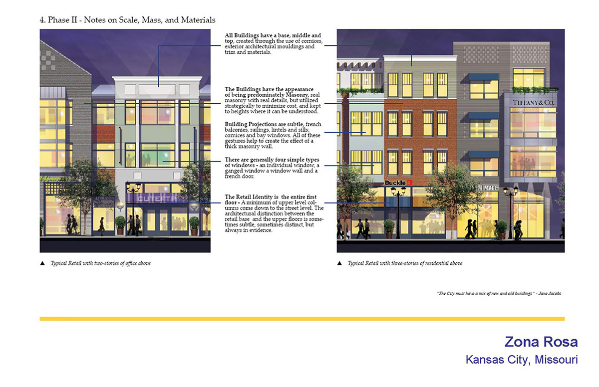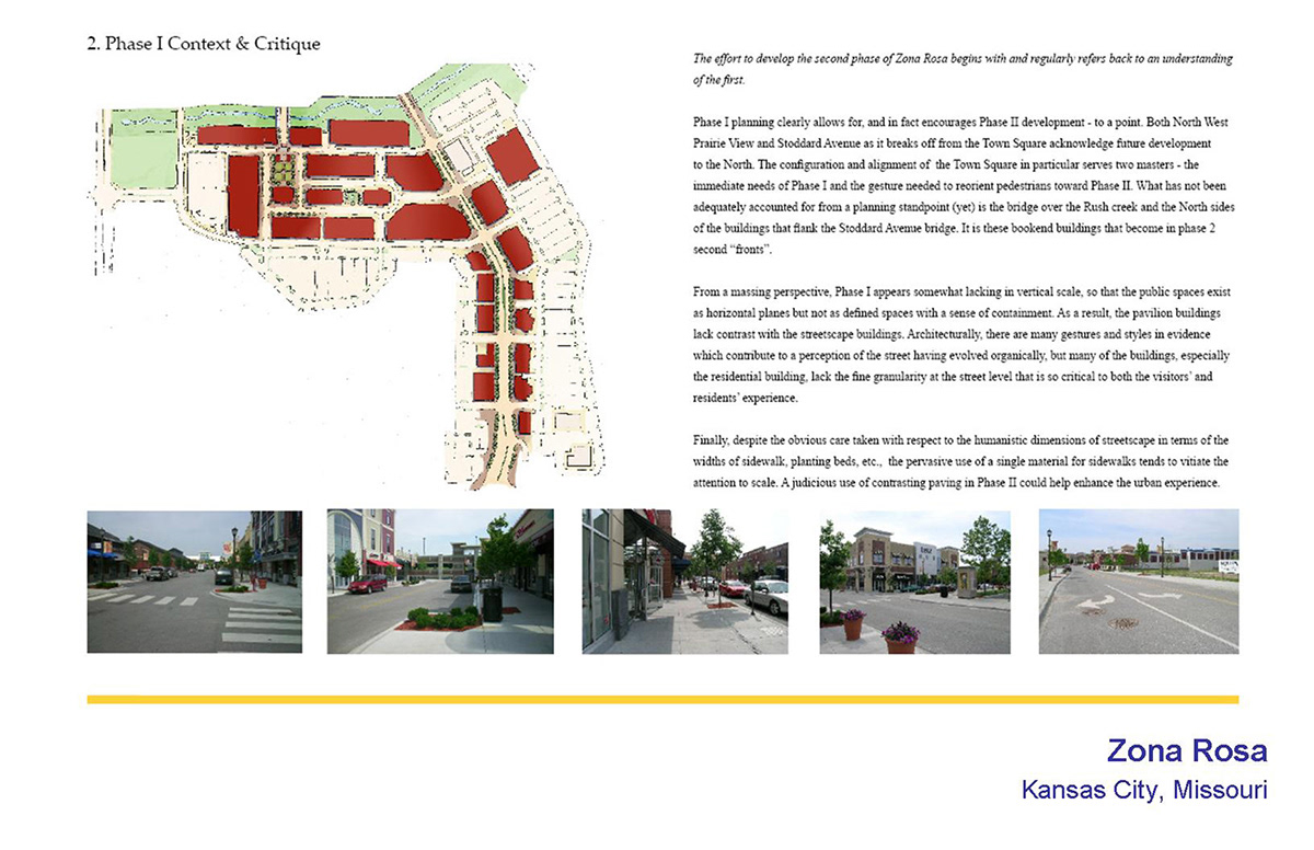 Zona Rosa is an existing life-style center in Kansas City, Missouri. The master plan for the second phase required jumping as stream which was the northern edge of first phase. Therefore, creating a strong connection between the two became critical. The strategy was to create a series of "events" to lure shoppers across a bridge and into phase II.